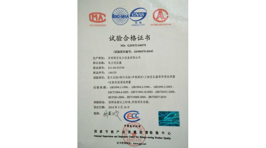 電力變壓器試驗(yàn)合格證書